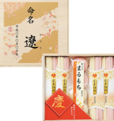 よろこび事にふさわしい「慶寿紅白うどん」と「めでたい丸もち」のセットは当店の1番人気アイテムです!木箱に入っているので高級感があり、おめでたい出産のお返しギフトとして高く人気を集めています。全部で4種類