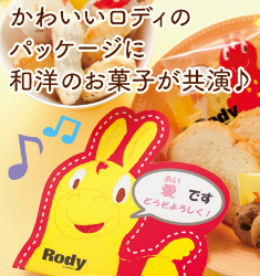 カラフルなロディのパッケージの中身は和洋のお菓子がたくさん。更にお菓子が入っている缶がかわいいのも人気のひとつです。